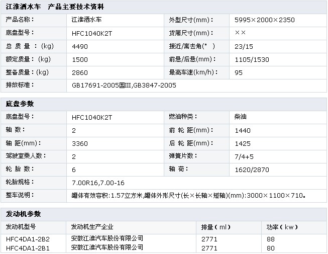江淮灑水車  底盤型號:HFC1040K2T 額定質(zhì)量:1500